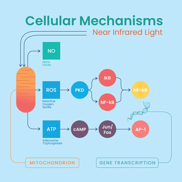The current and widely accepted proposal is that low level visible red to near infrared light (NIR) energy is absorbed by mitochondria and converted into ATP for cellular use. In addition, the process creates mild oxidants (ROS), which leads to gene transcription and then to cellular repair and healing. The process also unclogs the chain that has been clogged by nitric oxide (NO).[1] The nitric oxide is then released back into the system. Nitric oxide is a molecule that our body produces to help its 50 trillion cells communicate with each other. This communication happens by transmission of signals throughout the entire body. Additionally, nitric oxide helps to dilate the blood vessels and improve blood circulation.